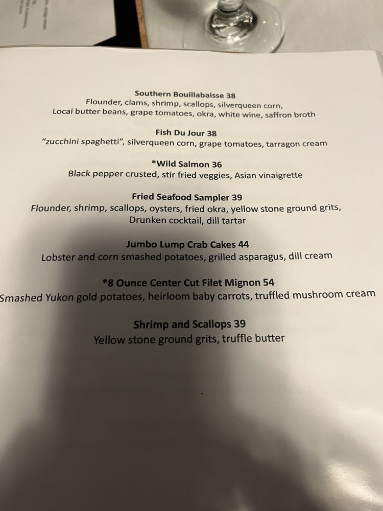 Flounder, clams, shrimp, scallops, silverqueen corn, local butter beans, grape tomatoes, okra, white wine saffron broth
